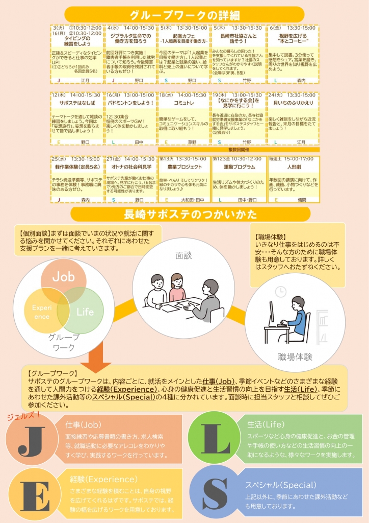 こんにちは! 長崎若者サポートステーション、 サポステです。 11月のサポステカレンダーを お届けします。 今月からサポステカレンダーを リニューアルしました! グループワークを4種に (通称:JELSジェルズ)に分けてお...